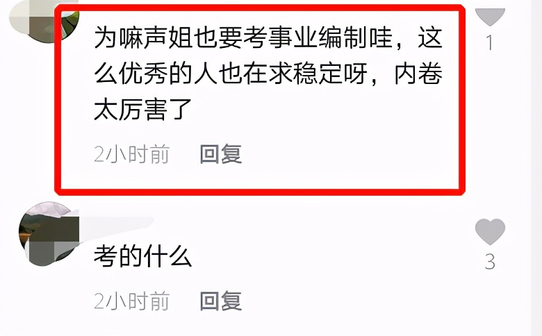 大部分网友都对余声考编一事感到十分惊讶,纷纷质疑道:“主持人也要考编啊?”还有人直指她是在求稳定,当下“内卷”严重。