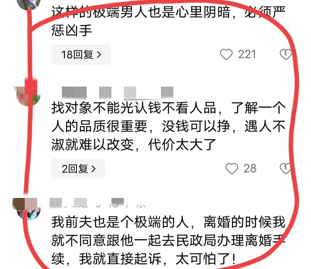 还有一位朋友更是讲述了自己的亲身经历:我前夫也是个极端的人,离婚的时候我不同意跟他一起去民政局办理离婚手续,我就直接起诉,太可怕了。