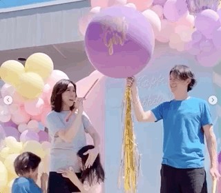 钟嘉欣将气球戳破,粉色的粉末飘散开来,象征着三胎性别是女儿。