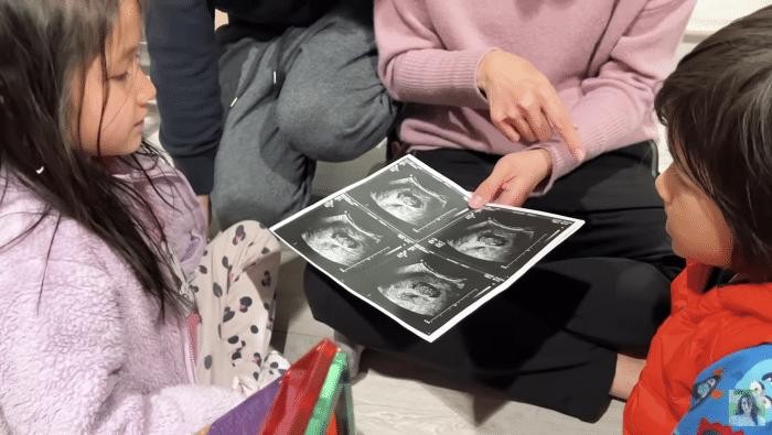 一家四口幸福出镜,钟嘉欣蹲在地上的时候,显得孕肚格外大,她搂着儿子,丈夫则一只手护着钟嘉欣的腰,一只手护着女儿,画面温馨。