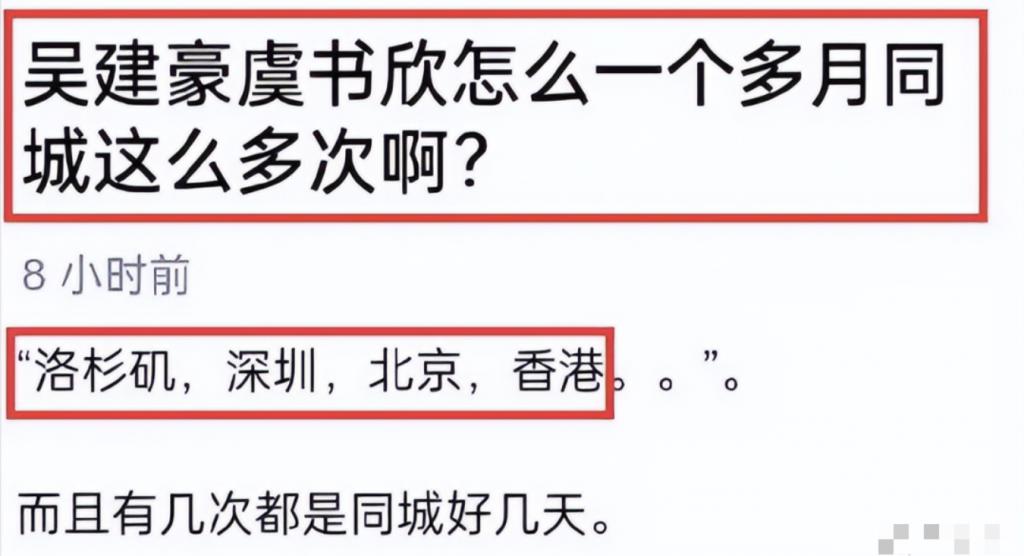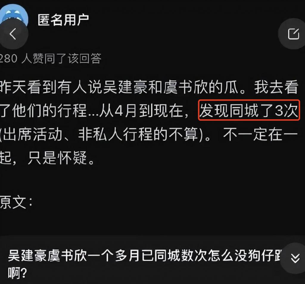 事情的起因是某乎上有位匿名用户整理了虞书欣和吴建豪的行程,发现俩人从 4 月份到现在同城次数很多,