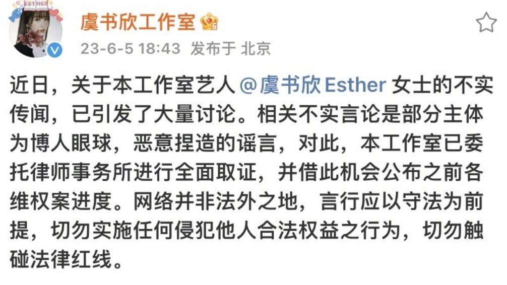 虞书欣工作室也辟了谣,称是不实传闻,