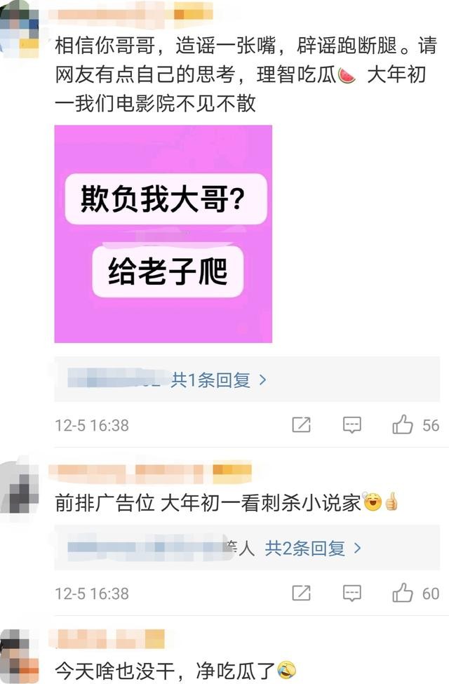 很多网友看到雷佳音的回应留言道"相信你哥哥,造谣一张嘴,辟谣跑断腿,请网友有点自己的思考,理性吃瓜,大年初一我们电影院不见不散"。