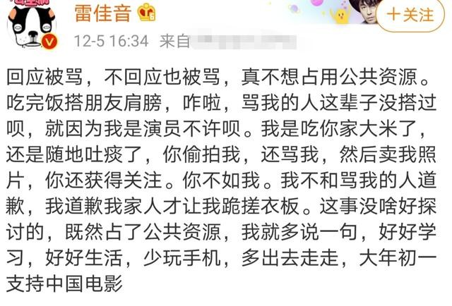对此,本尊雷佳音在12月5日下午发长文痛批狗仔:"吃完饭搭朋友肩膀咋啦,骂我的人这辈子都没搭过肩膀呗,就是因为我是演员不许"。在发文最后他还表示既然占用了资源,大年初一就去看电影吧,为自己的新电影《刺客小说家》进行了宣传。