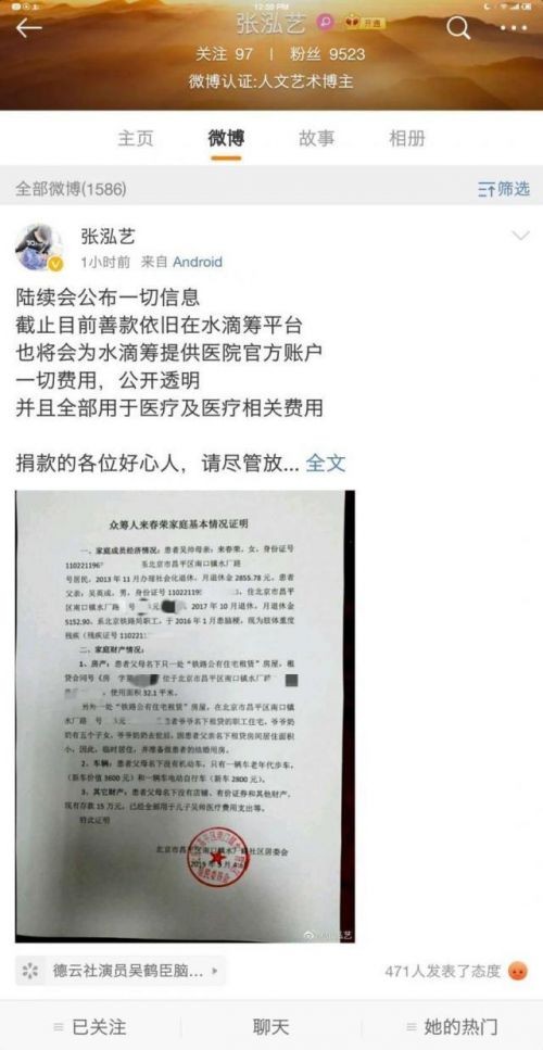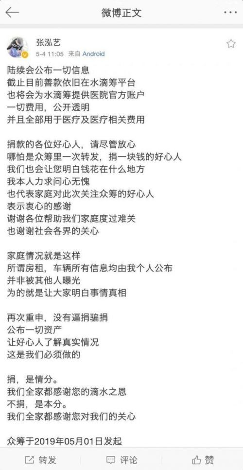 当天上午11时08分,北青报记者看到张泓艺刚刚发出的微博长文里写道,“陆续会公布一切信息,截止目前善款依旧在水滴众筹平台,也将会为水滴众筹平台提供医院官方账户,一切费用,公开透明,并且全部用于医疗及医疗相关费用。”并再次重申,没有逼捐骗捐。
