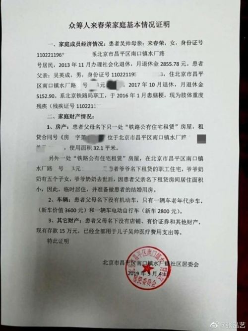 张泓艺长文下方,附着一份加盖了北京市昌平区南口镇水厂路社区居委会公章的《众筹人来春荣家庭基本情况证明》,这里面提到,患者吴帅母亲来春荣为南口镇水厂路社区居民,2013年11月办理社会化退休,月退休金为2855.78元。患者父亲吴英成在2017年10月退休,月退休金5152.90元,系北京铁路局职工,于2016年1月患脑梗,现为肢体重度残疾。
