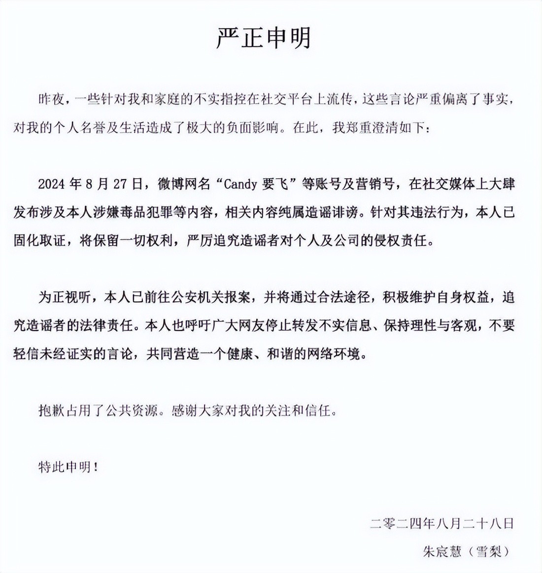 雪梨针对“Candy要飞”的爆料发布严正声明,否认所有指控,并宣布已向公安机关报案。