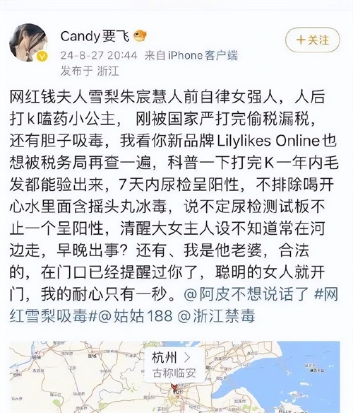 社交媒体用户“Candy要飞”在27日晚发布指控,称网红雪梨在8月26日晚于某酒店2818房间吸毒,并直接点名雪梨为张珩前妻。