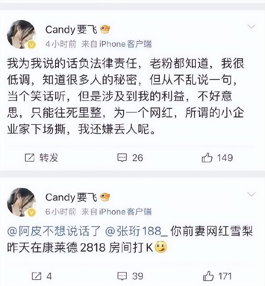 面对“Candy要飞”的爆料,雪梨方面选择删除询问留言并关闭评论,张珩则直接回应称爆料虚假不实。随后,“Candy要飞”宣称已就“雪梨”疑似聚众吸毒事件报警。