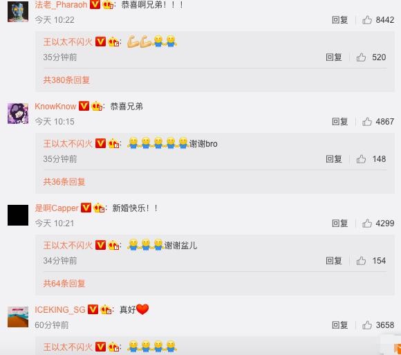王以太结婚的消息一发出,不少说唱歌手就纷纷在评论里祝福这对新人百年好合。