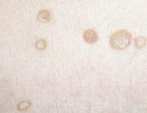 (3)扁平疣:顾名思义,扁平疣相对比较扁平,皮疹没有明显凸起,表面不光滑,可能是淡褐色,也可能是淡粉色或肤色。