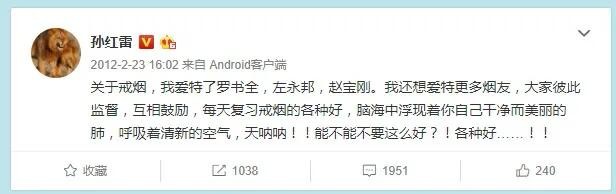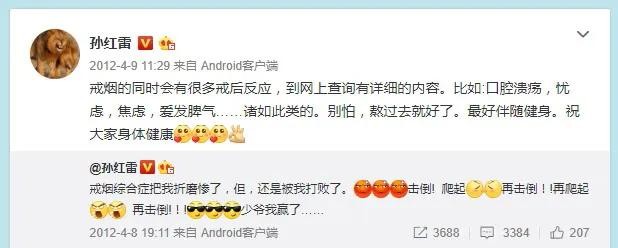 说起戒烟,孙红雷可以说是下了一番功夫,早在2012年,也就是七年前,孙红雷就发誓要戒烟,并且微博记录了自己的戒烟一点一滴,功夫不负有心人,孙红雷戒烟成功了,且在第一时间和粉丝分享了这个喜讯,但是戒烟之后又出现了一个问题,不抽烟改吃饭了,一个月胖了26斤,对于瞬间飙升的体重孙红雷也很苦恼,戒烟成功又要戒饭,孙红雷对自己要求也挺严格的。