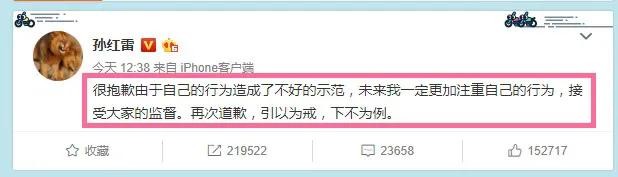 孙红雷抽烟被曝光之后,颜王本人也很快做了回应,微博发文道歉,并表示自己会引以为戒,下不为例的,不过这个道歉文案有点眼熟,似乎是套用的,没有一点诚意,也没有表示要戒烟的意思。