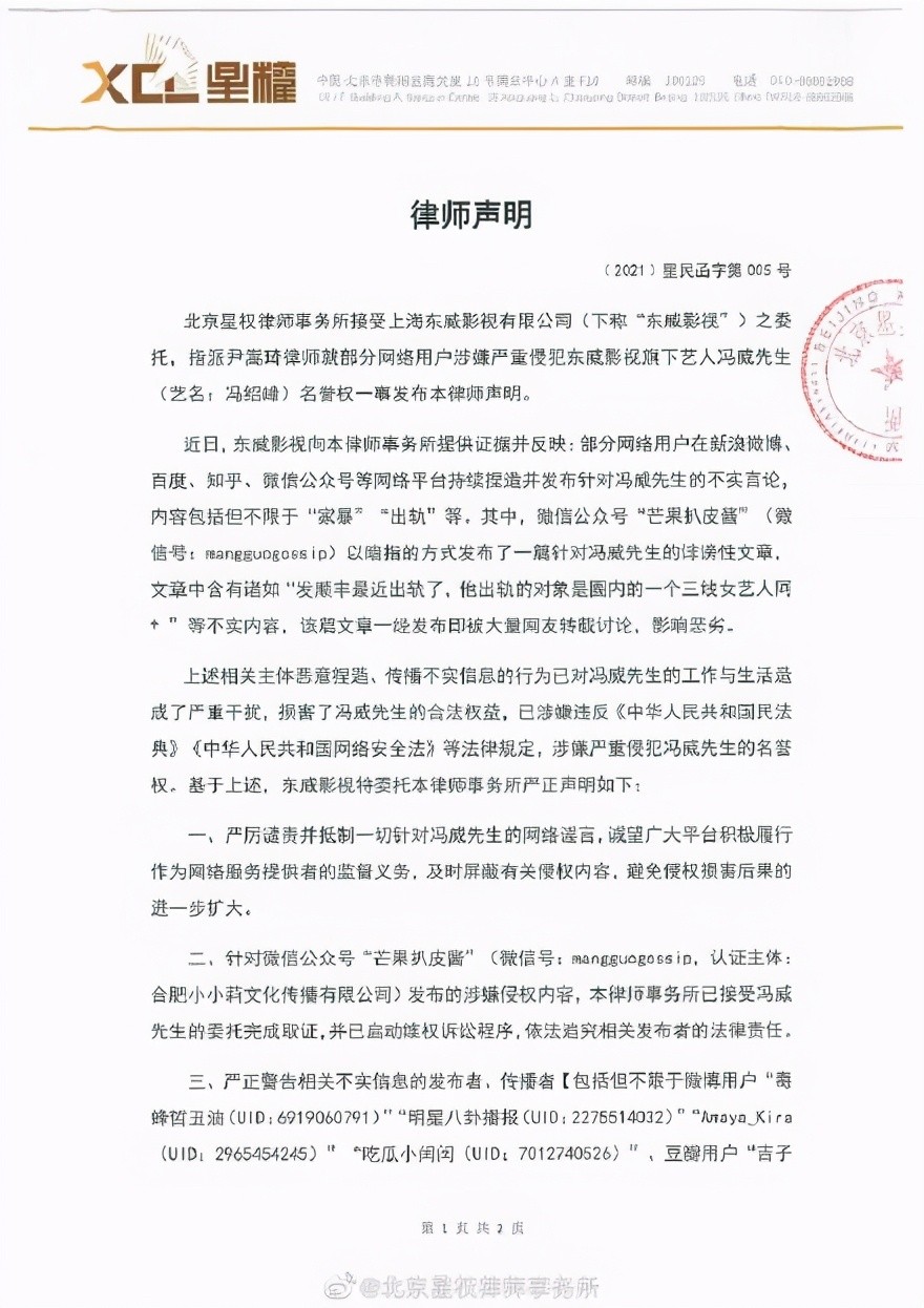 冯绍峰工作室就"出轨"等不实言论发布律师声明