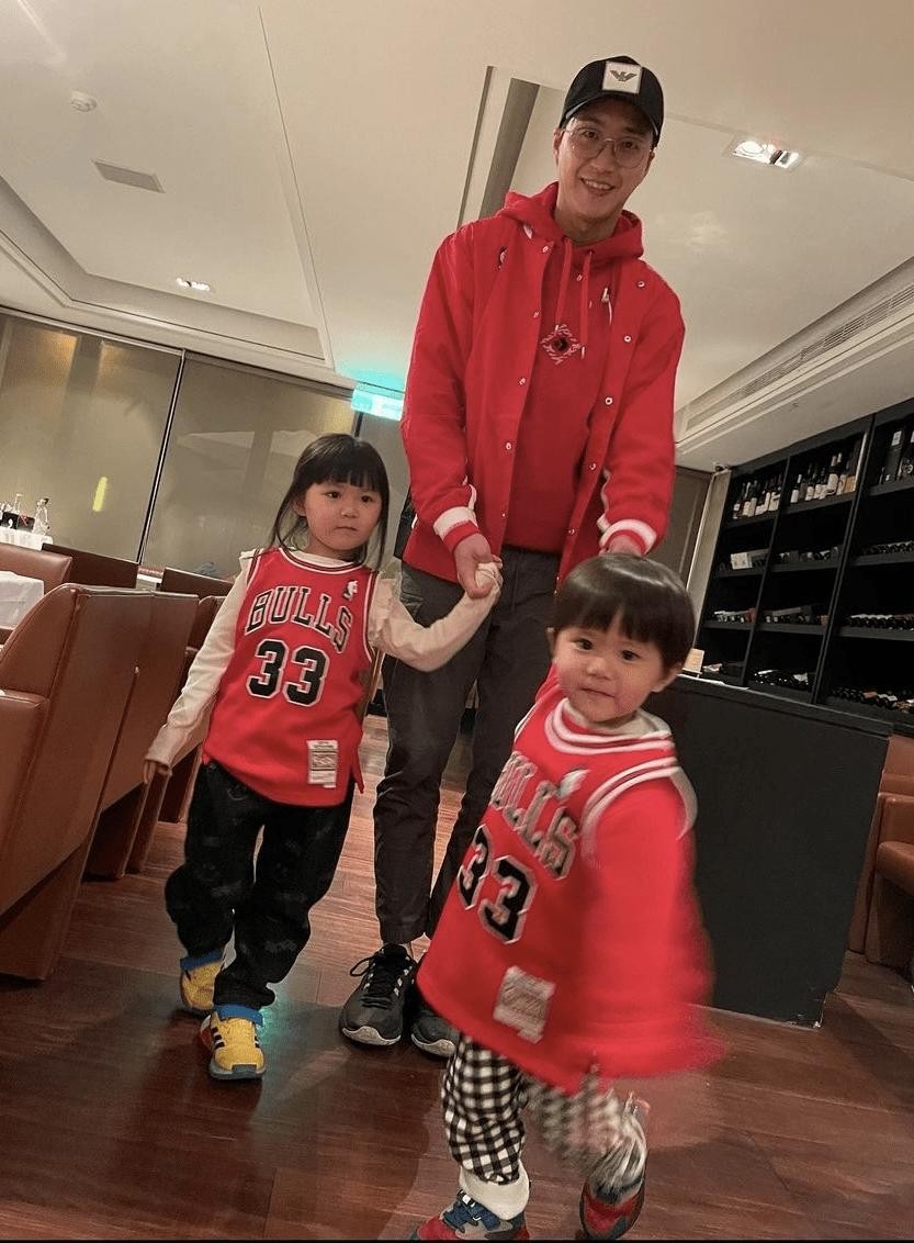 江宏杰一人牵着一双儿女出镜,爱拉酱和KOU君都穿着红色球衣出镜,江宏杰也是红色卫衣加身,十分喜庆。