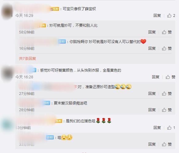 在看到林妙可的近照后,网友评论道:“但宝贝长得像薛宝钗。”还有人发现林妙可很喜欢黄色,因为她说:“从头饰到衣服,都是黄色的。”也有细心的网友认为林妙可很喜欢粉丝,他们说:“这是我们的支持色。”