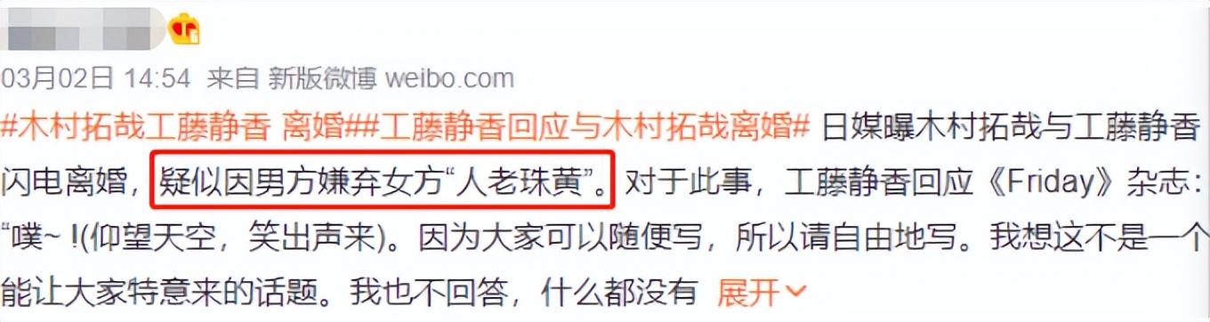 让人大无语的是,你要传人家离婚就传人家离婚,可传着传着,居然开始强调两人“离婚”的理由是因为木村拓哉嫌弃工藤静香人老珠黄,美貌不再了。