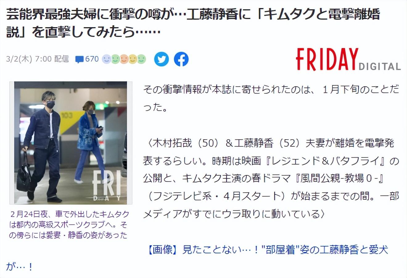日媒也是没闲着,先是《文春》声称女性学者上野千鹤子曾秘密结婚,接着《Friday》又爆料50岁的木村拓哉和52岁的工藤静香,也要闪电离婚了。