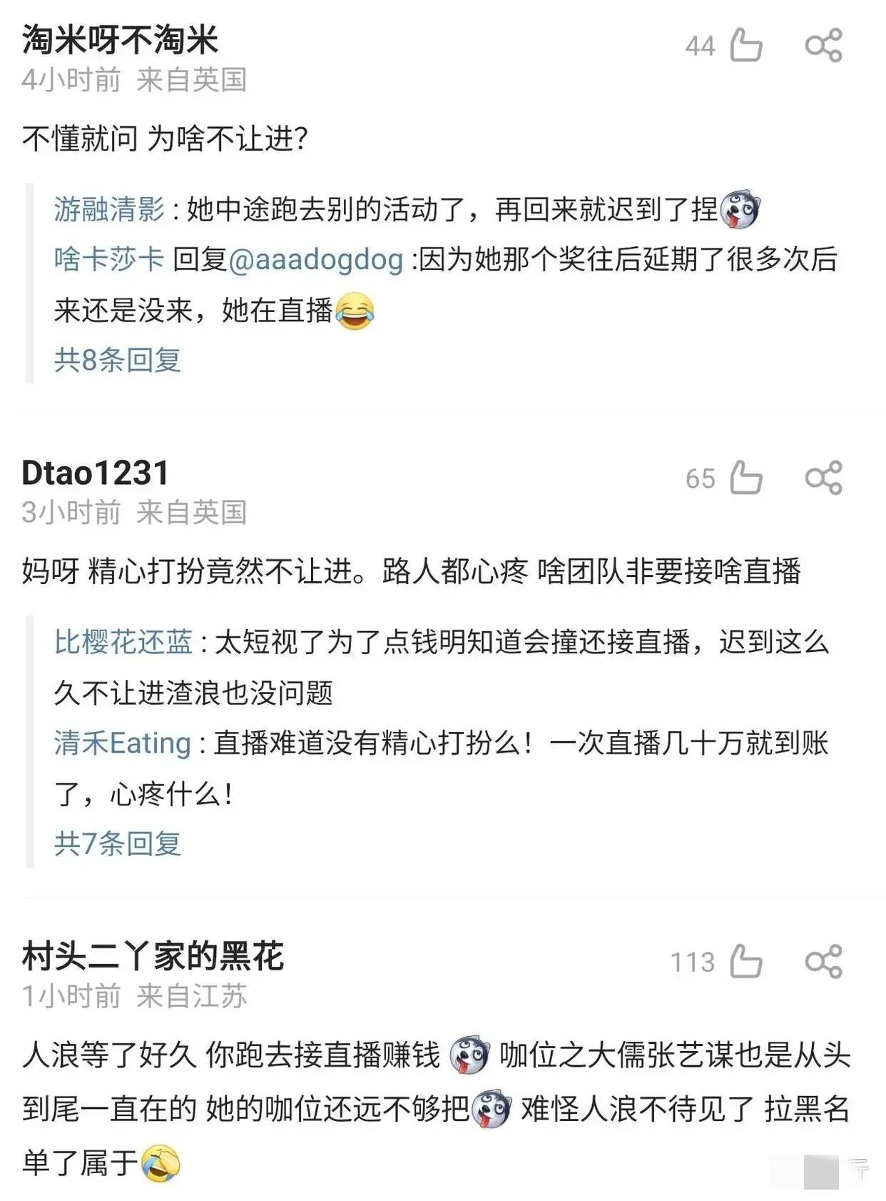 好家伙这就有点不可思议了,微博之夜和带货孰轻孰重作为明星她不可能拎不清吧,就连国师张艺谋都是准点参加的也是从节目开始一直到节目结束整场都在。