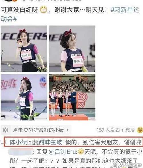 近日,陈小纭于小彤分手一事引发网友热议。有网友爆料陈小纭闺蜜吕钊是现实版林有有,称其插足抢走了于小彤,于小彤吕钊同款发帖也引发诸多猜测。随后,陈小纭在评论区回复网友辟谣此事,表示:“假的,别伤害我朋友,谢谢啦。”