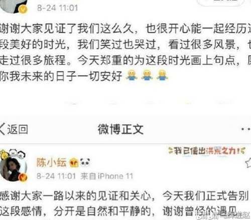 在8月24日七夕节前一天,于小彤陈小纭双双发文宣布分手,这对以往甜蜜的姐弟恋最终以遗憾收场。不过看两人的发文都很温柔,听起来像是好聚好散的一个结果。但是可能由于分手之前,陈小纭曾多次晒出绿色物品,所以大家对于分手原因还是有诸多猜测,不禁猜疑是否有人插足陈小纭和于小彤的恋情。