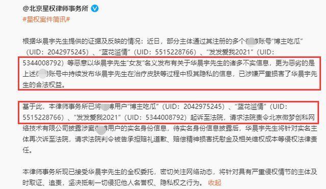 北京某律师事务所也发出了严正声明,称某主体注册多个社交平台账号,然后恶意造谣华晨宇整容、出轨。所晒出的植发图,其实只是他在治疗皮肤问题时的照片,这已经盗用了他的私密信息。