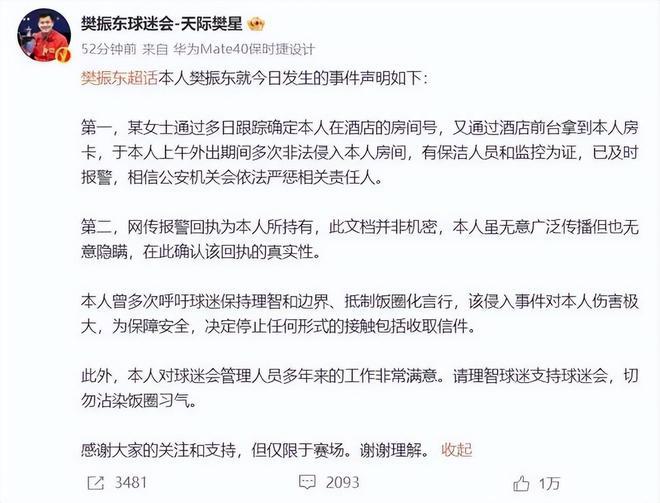 此前,乒乓球运动员樊振东也遭遇过粉丝送机引混乱,被 " 私生粉 " 跟踪多日,甚至非法入侵房间等事件。他也曾多次公开表态:不要把饭圈陋习带进竞技体育。