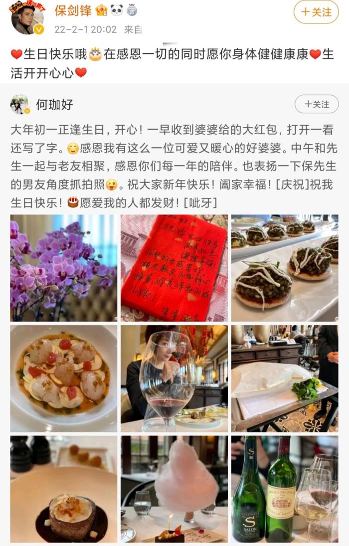 2月1日,男星保剑锋的妻子何珈好在社交平台晒出庆生照,夫妻恩爱十分令人羡慕。