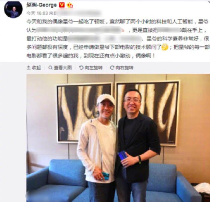网友透露和偶像星爷一起吃了两个小时饭,全程在聊科技和人工智能,并夸赞星爷的科学素养非常好,很多问题都极有深度,自己已经申请做星爷下部电影的顾问了。