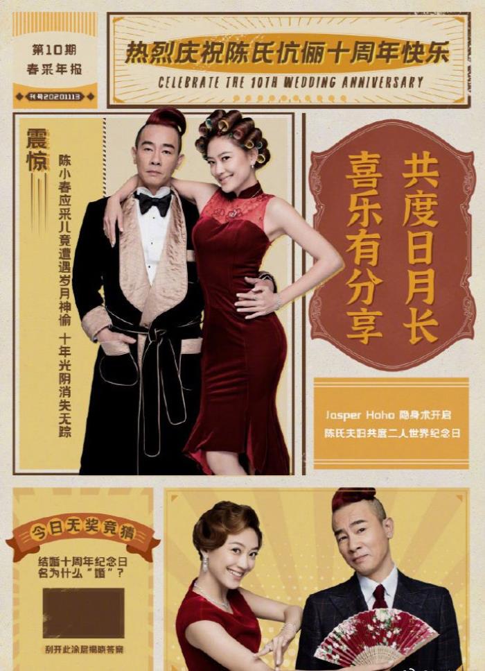 11月13日下午,陈小春发文庆祝与应采儿结婚十周年:“十年前今天…谢谢你跟我走到今天”。其中配图才是真的有心,那是一张名为第十期“春采年报”的自制的创意海报。那上面除了夫妻二人的合影,还写有“热烈庆祝陈氏伉俪十周年快乐”、“Jasper Hoho隐身术开启,陈氏夫妇共度二人世界纪念日”等等,超级会玩了,左下角还有无奖竞猜呢。