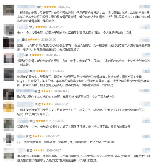 其中部分网友表示“李一桐依旧演技优秀,李鸿其从青年到老年的状态也诠释的很好,无论是亲情还是爱情,都会有感动到的情节,特别是结局很感人”、“很温暖的剧情,爱你带时间的尽头,科幻+爱情 ,太美好了”、 “画面清新唯美,音乐轻缓,带着他(她)静静地看;七夕上映,十分应景”、 “这部片子把有些生活细节刻画得太真实,喜欢一个人就是想给他一切呀。”