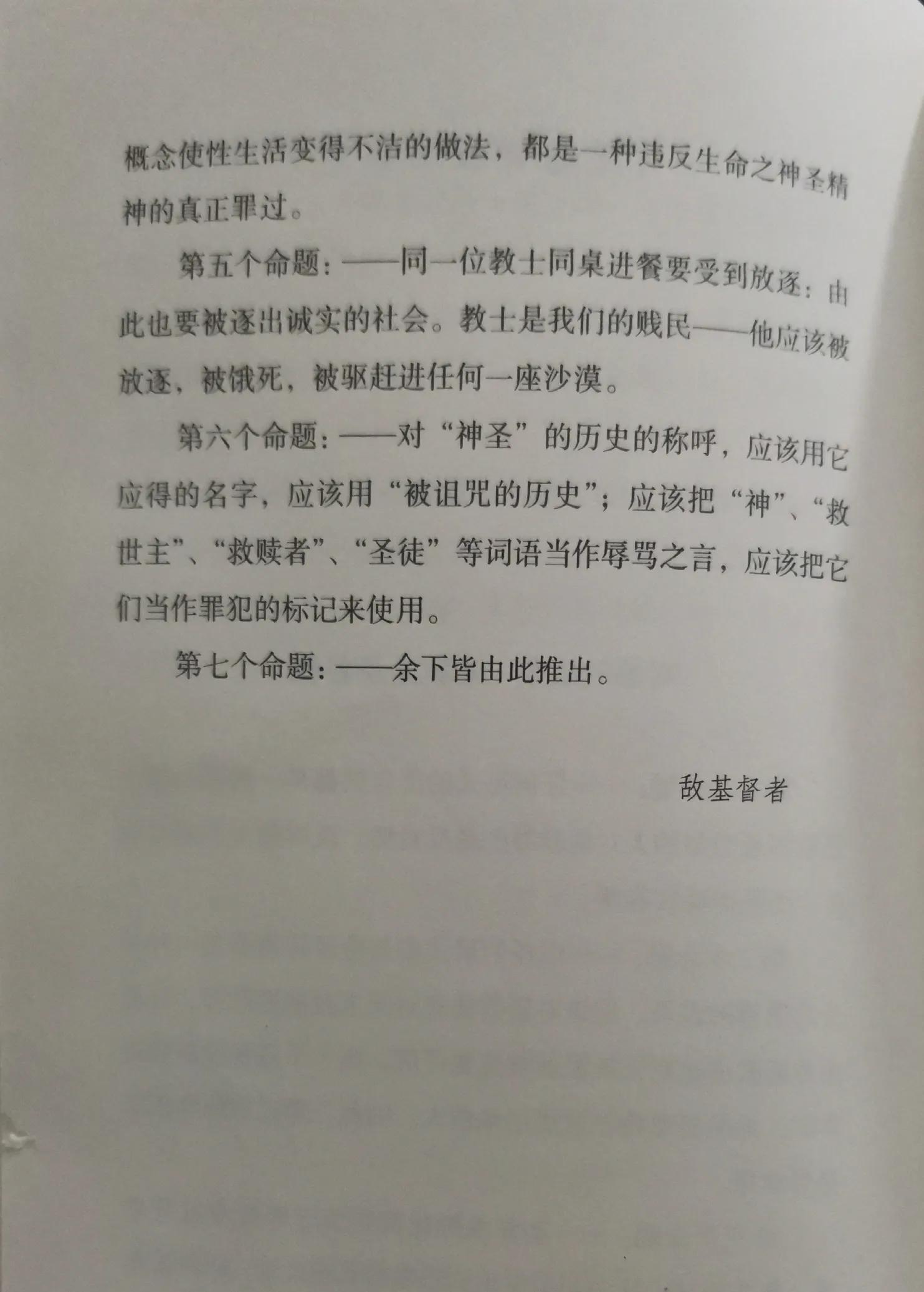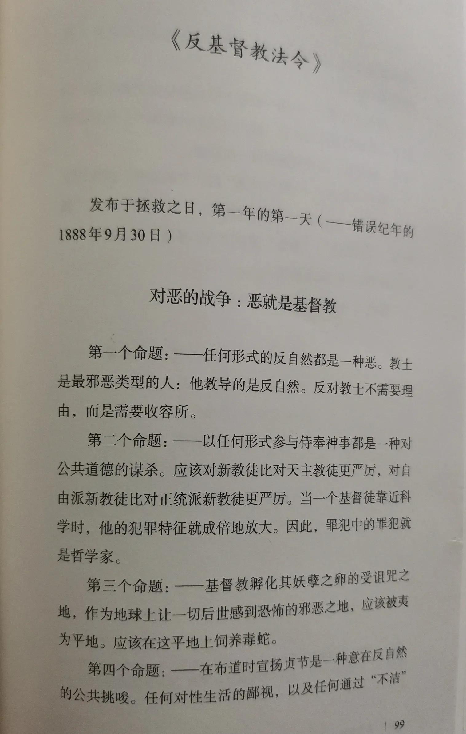 《敌基督者》是尼采发疯前的绝笔之作,让我感到震惊而没法读懂的一本书。读起来很吃力,翻译的字都认识组成一句话,一段话就如此的神奇。尼采试着去从否定中找到进步的方向,如果说否定与肯定那一个离真理更近,那只能说否定离真理更近一些。不管他对康德、保罗和耶稣的指控都表达了他的立场,当然我的学识没办法让我理解双方,也不知道对错,我感觉到这在纸上的交锋胜过千军万马,精彩,精彩,精彩!