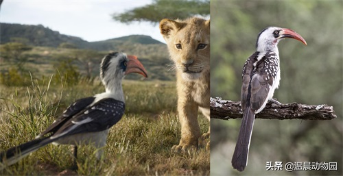 为了让大家看得明白,我特意找到坦桑尼亚红嘴犀鸟的照片与电影中的沙祖拼接在一起,大家看看是不是相当还原(但还是有些细节不同的)。