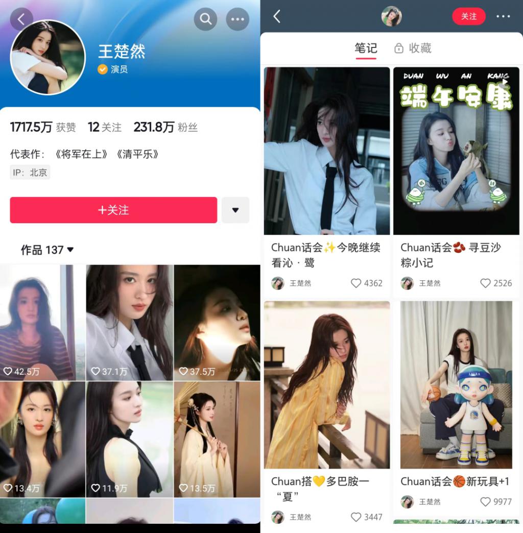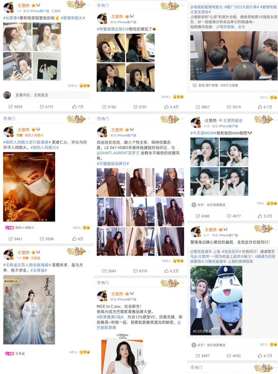 比起那些在小号上汇报吃喝拉撒、抖音上跳舞卖萌、媚粉宠粉怼粉花招百出的小花们,王楚然的营业内容全是宣传物料和风格大差不差的美图。如此流水线一般统一培训的笑容和动作,再美的脸看多了也只剩下单一的无聊。