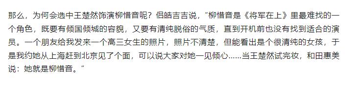 2017 年网剧《将军在上》开拍前,还在读高中的王楚然凭一张照片就拿下了倾国倾城的表妹柳惜音一角。