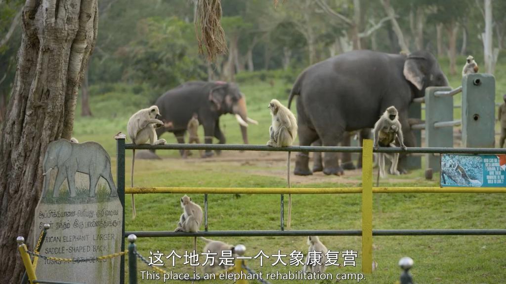 人与自然和谐共处,仙鹤栖息在野牛身上,野猪在大象营里到处走,猴子吃着大象剩下的食物。在特写镜头里野趣十足。