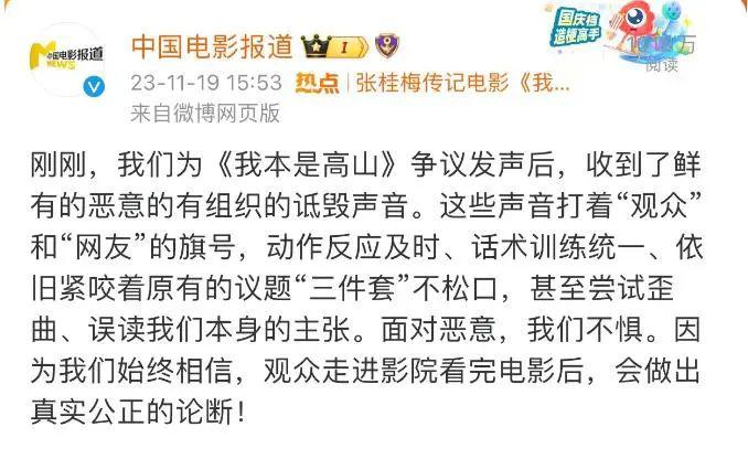 义正言辞的反击发布之后,并没有起到平息争论的作用,双方继续争吵,导致了《我本是高山》的票房预期持续下滑。