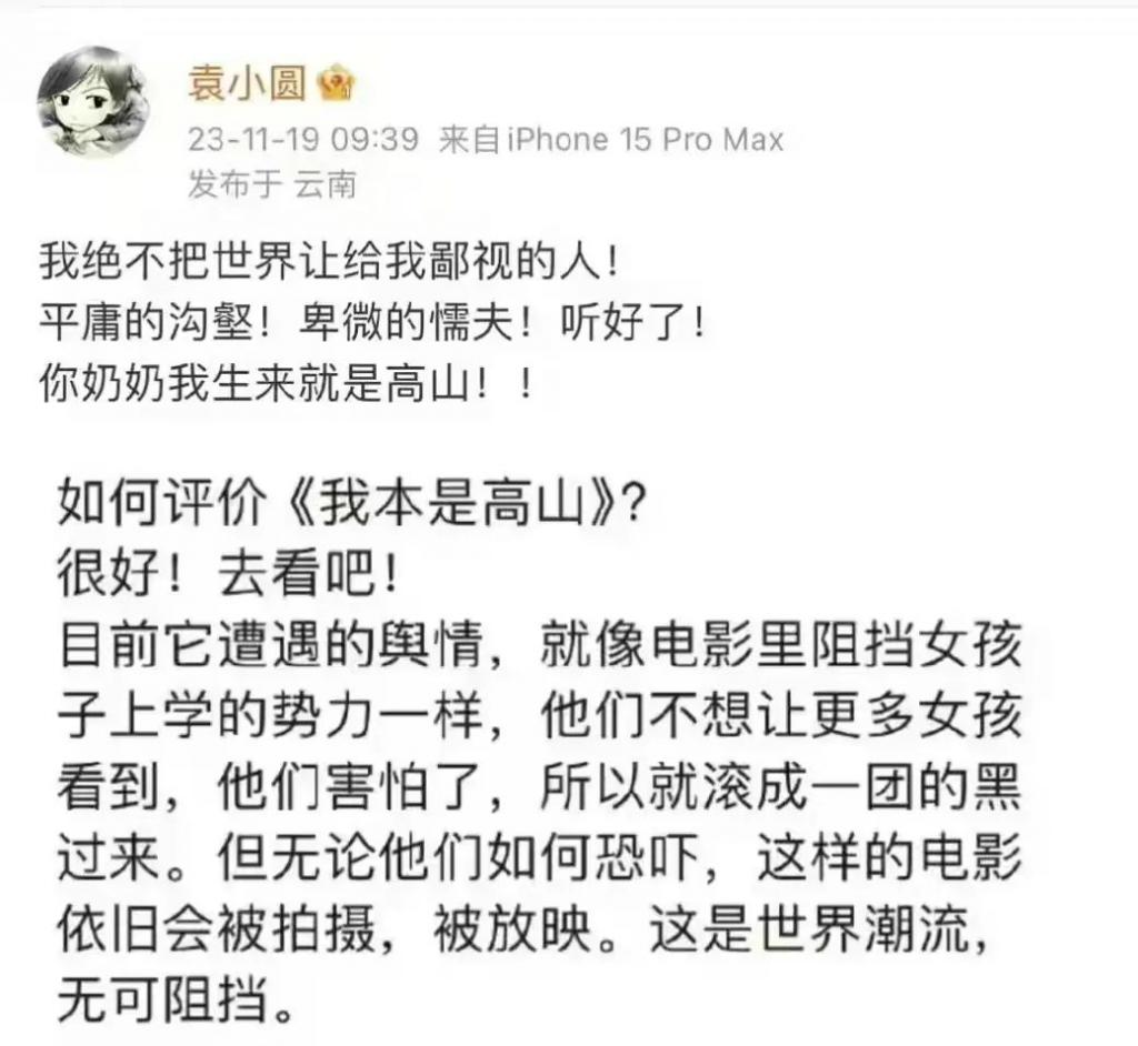 片方和影片的支持者选择站在高山上对沟壑进行声讨,却忘了《我本是高山》的本意绝非自命清高,高山本应有宽容的胸怀,而不是如此傲慢。