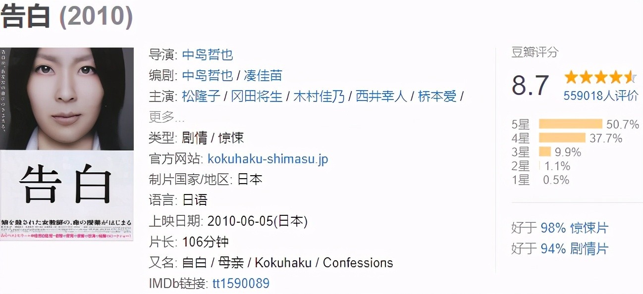 电影《告白》的并非一场日式纯美之恋,而是一场震人心魄对人性阴暗超常规的揭露,中岛哲也一黑到底对何为“恶”的呈现是那般残酷予人深思,慢镜头与唯美画面的交织皆为将一切美好打破,罪与罚以暴制暴极度的渲染,阴暗的心魔营造了最好的惊悚。