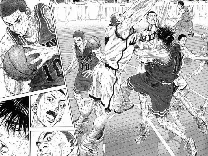 当然,“巅峰”二字并不单单指剧情方面。纵观整部漫画,井上雄彦从最初稚嫩的画工一路成长,到了漫画后期,尤其是山王战的最终绝杀,画面充满了张力,紧张气氛渲染到了极致,连一个字也是多余,精彩二字实至名归。