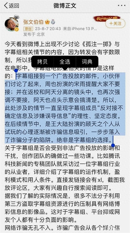 首先,电影《孤注一掷》的争议。这部电影以缅北诈骗为题材,取得了巨大的成功,但其中涉及字幕组成员接受广告邀约的情节引起了争议。一方面,电影的支持者认为,电影没有冒犯字幕组,只是呈现了字幕组成员的坚定态度和诈骗集团的引诱。另一方面,一些字幕组支持者则认为电影在一定程度上暗示字幕组是一个盈利组织,这与事实不符。这一争议引发了网友热烈的讨论,反映了观众对于电影与字幕组之间关系的不同看法。