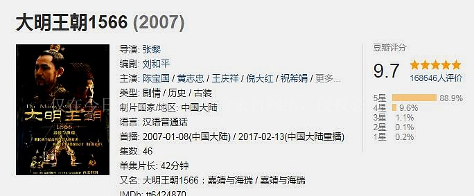 其次,值得一提的是《大明王朝1566》,同样评分高达97分。这部剧通过讲述嘉靖与海瑞的故事,深入展现了错综复杂的官场争斗和政治阴谋。导演的出身为摄影师,使得这部电视剧在视觉效果上也表现出色。观众在观看过程中会被紧凑的叙事结构和跌宕起伏的剧情所吸引。
