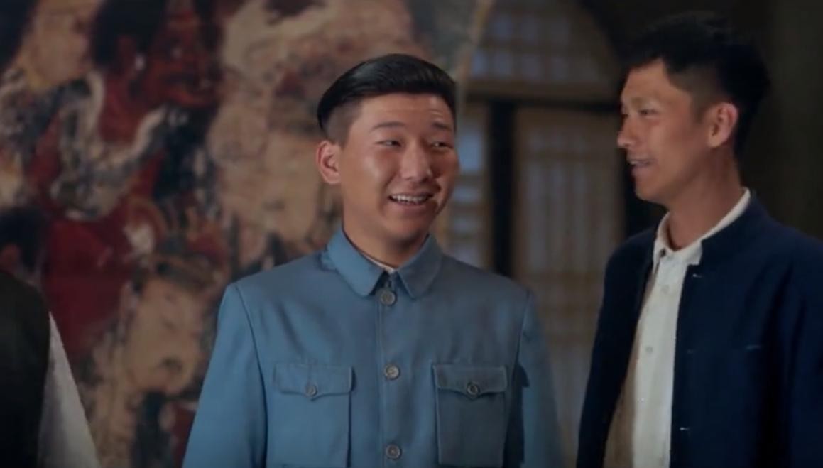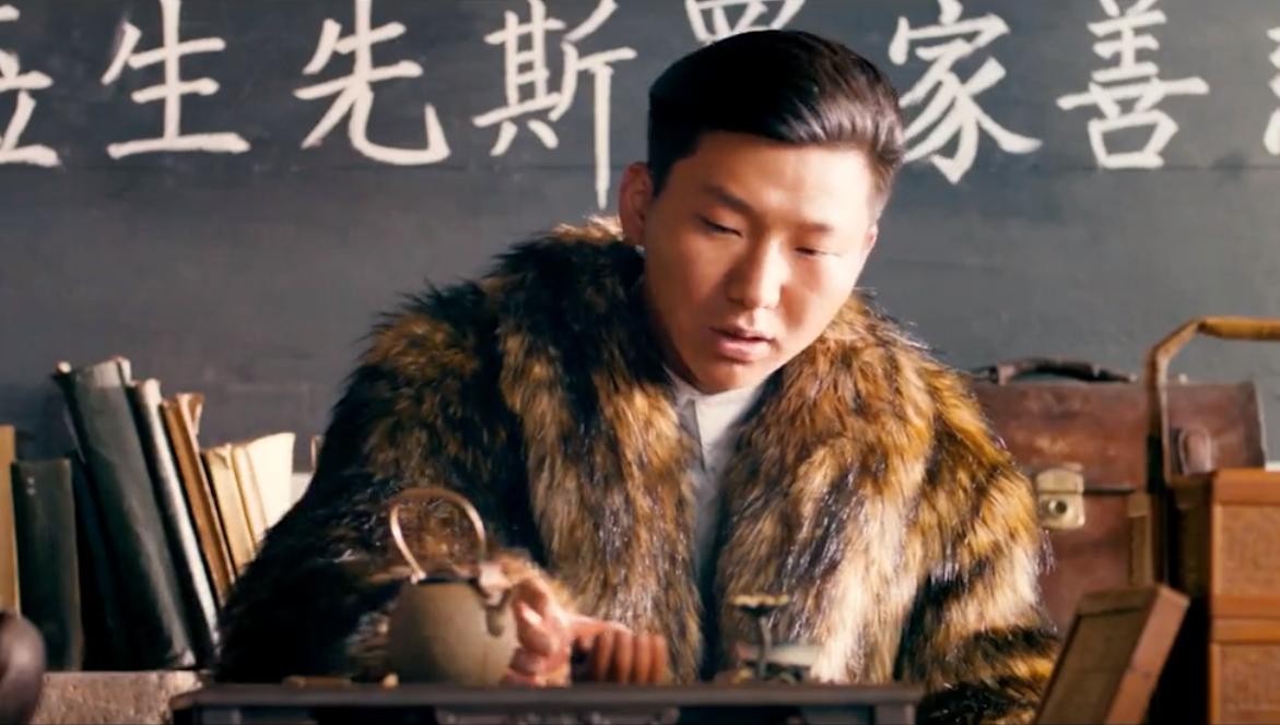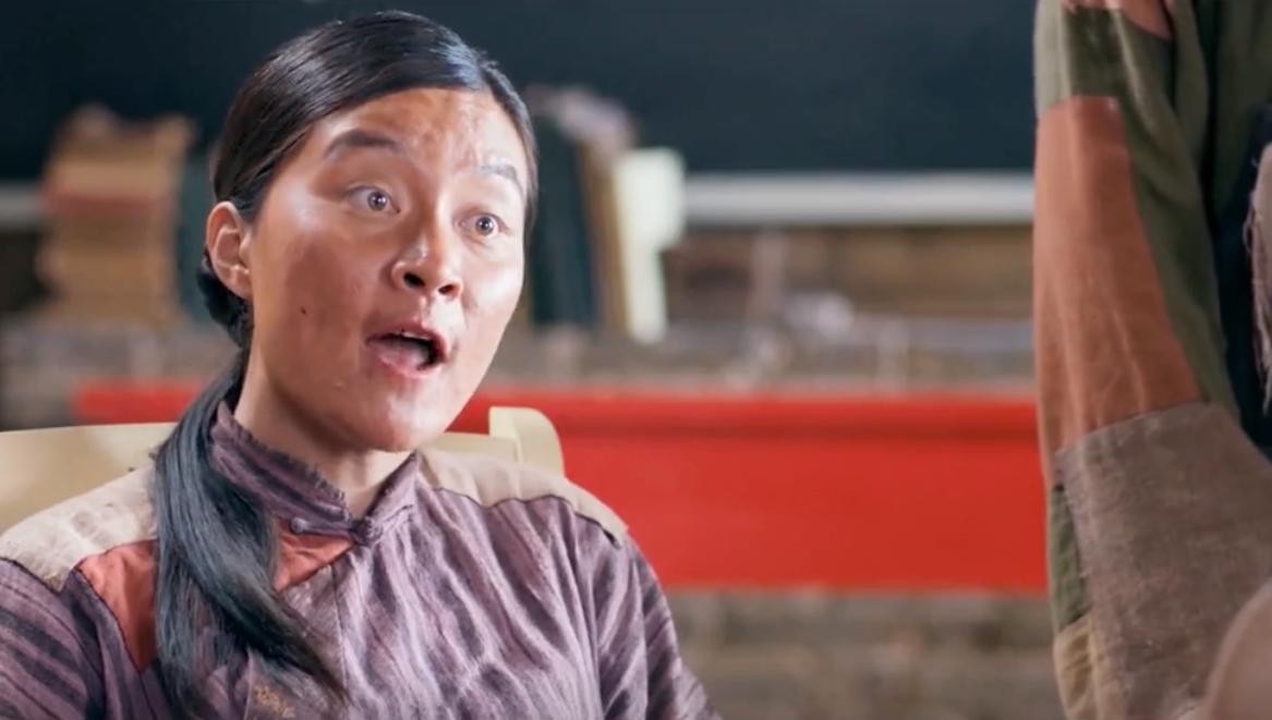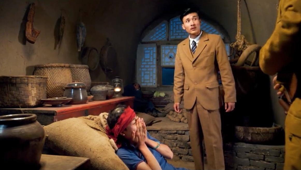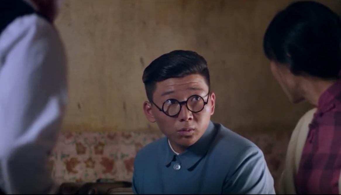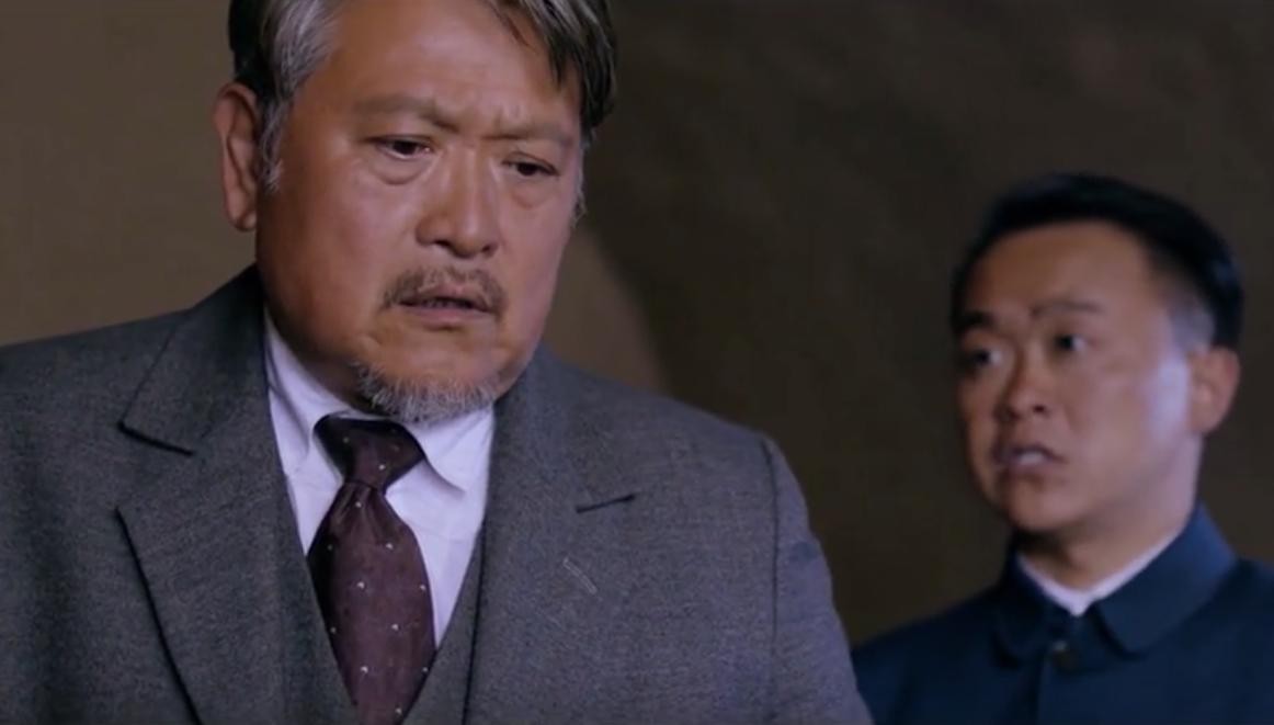 我们继续回到故事情节,在第一次特派员的检查中,铜匠伪装的吕得水老师假装用英语蒙混过关。