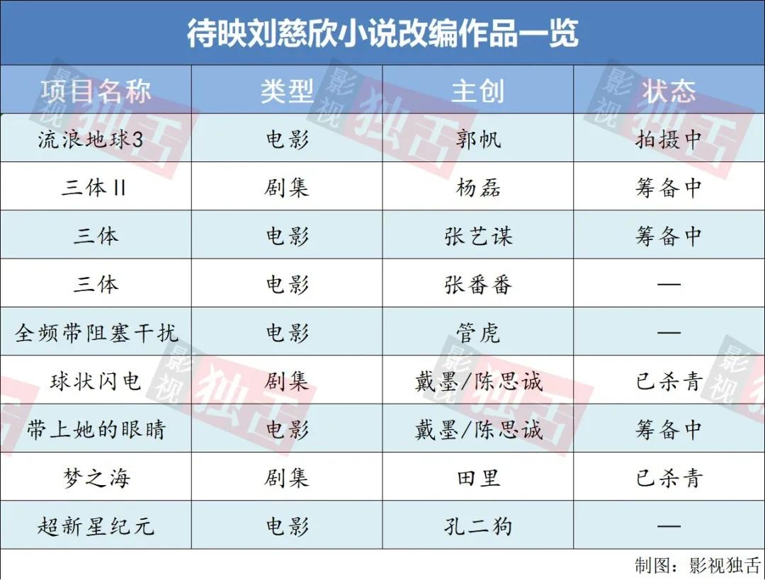 爆款当然有,像腾讯视频版的《三体》剧集、电影《流浪地球》系列,都取得了令人瞩目的成绩,也让刘慈欣小说成为影视改编的富矿。据不完全统计,各类待映的刘慈欣小说改编项目不下10个,其中包括已经立项和完成拍摄但还没上映的作品。