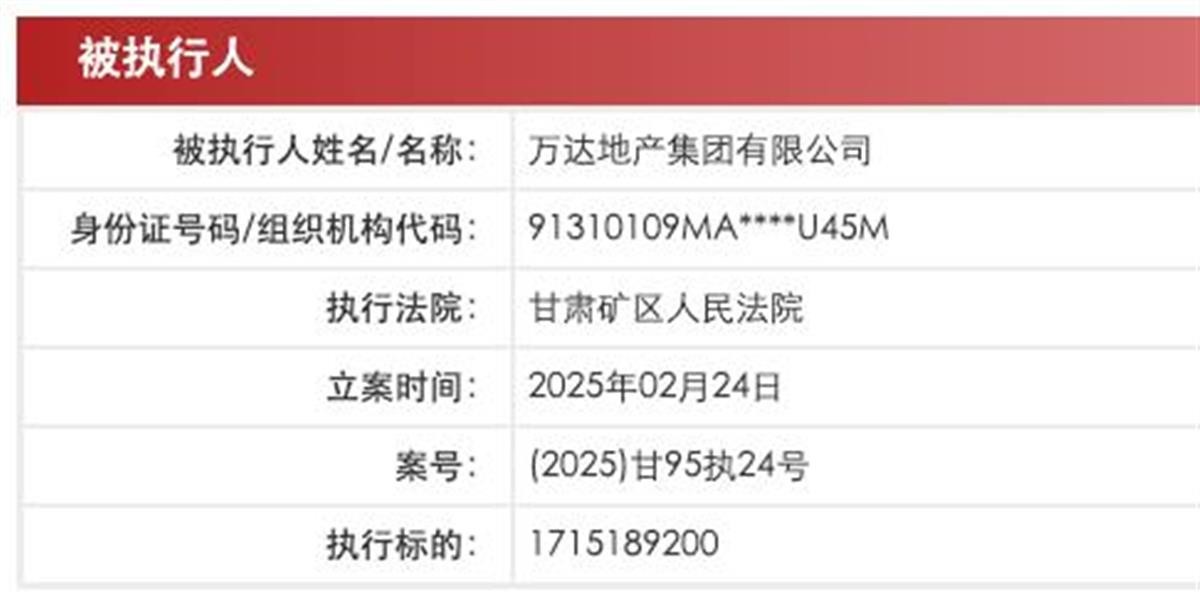 据界面新闻2月25日报道:中国执行信息公开网显示,2月24日,大连万达集团股份有限公司、万达地产集团有限公司等新增一则被执行人信息,执行标的17.1亿余元,执行法院为甘肃矿区人民法院。