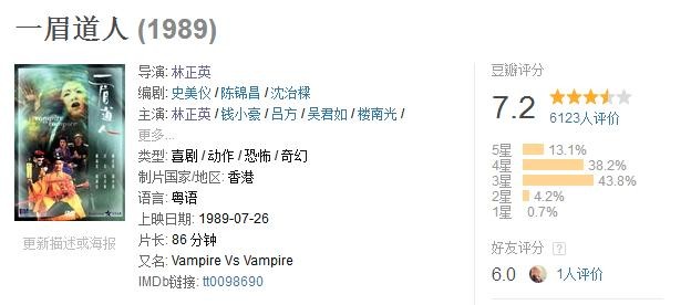 小时候看的第一部僵尸片,李丽珍洗澡的镜头看的我一愣一愣的2333。元华的僵尸演的也很搞笑。午马和陈友最后斗僵尸那段太经典了。