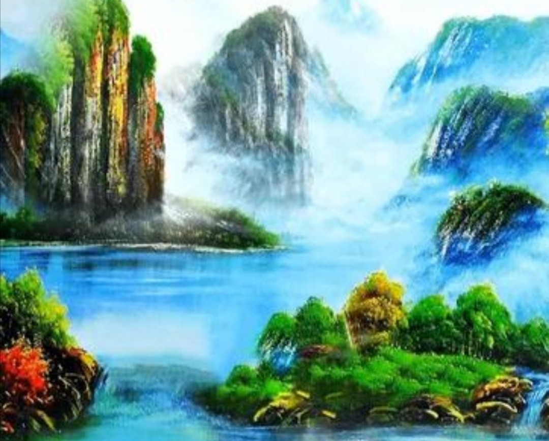 在这汪洋大海中的包裹中有座瑶海仙山,灵山秀海,神兽齐聚:彩凤、麒麟、寿鹿、仙狐;灵禽玄鹤、奇花瑶草,仙桃修竹留雲,把一座海中仙山的独特玄幻美景衬托的淋漓尽致。