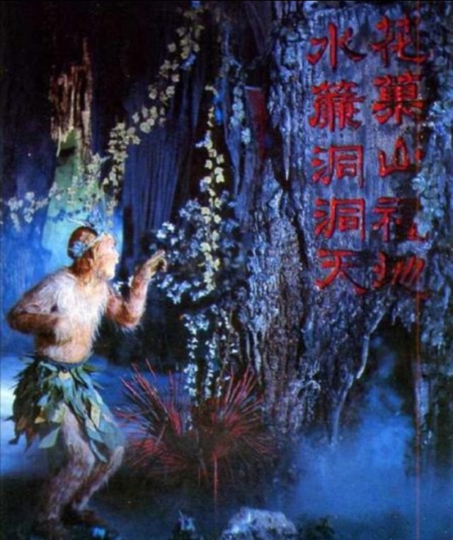 在被许诺进出山洞安然无恙者既可拜为大王的诱惑下,石猴自告奋勇、瞑目蹲身纵跳进水帘洞中
