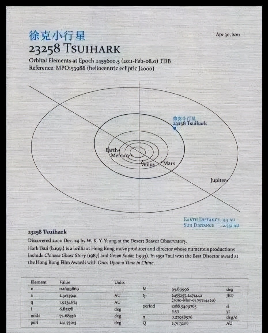 距离地球三十五亿公里,位于火星与土星之间,有一颗名为“徐克”的小行星,发现者是香港天文学家杨光宇。