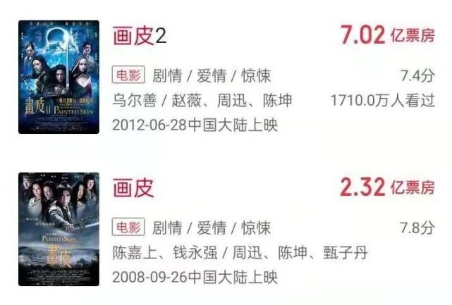 由于第一部为这部电影打下了良好的口碑和庞大的粉丝基础,《画皮2》虽然质量和口碑有所下降,豆瓣评分刚刚达到及格线,但电影的票房还是翻了几番,从第一部的两亿一下子窜到了7亿。